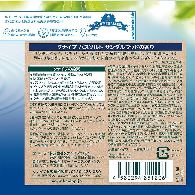 【クナイプ公式】 バスソルト サンダルウッドの香り 850g リラックス