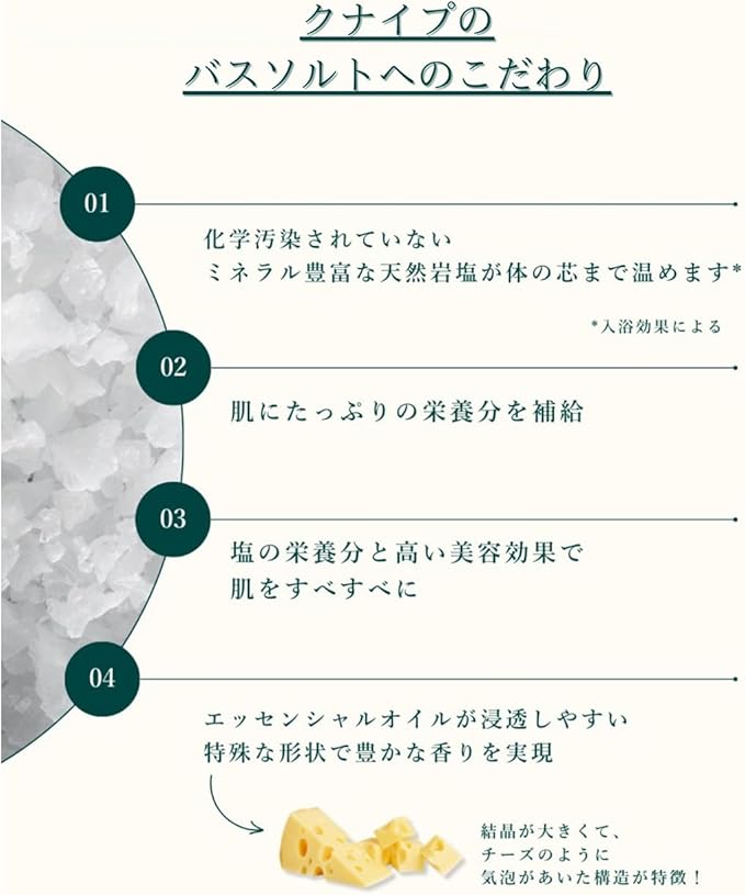 ➀2億5千万年前の古代海水を精製した岩塩と天然ハーブの精油(エッセンシャルオイル)から生まれたドイツのバスソルト。