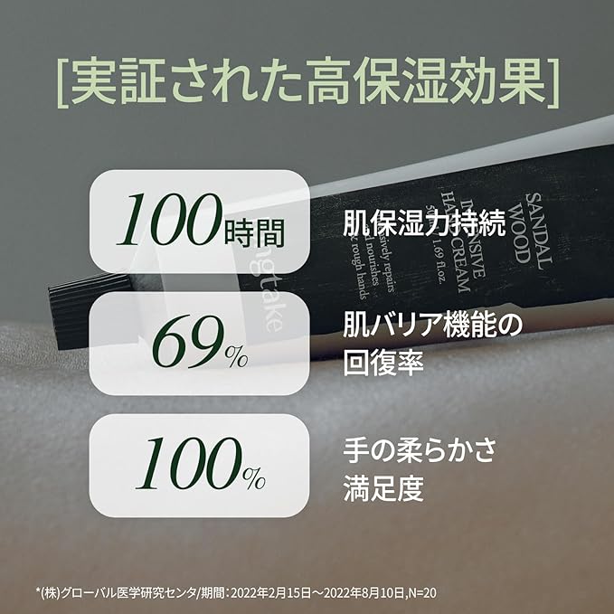 【検証された高い保湿力】ヒト臨床試験で確認された100時間持続する高い保湿力のサンダルウッドの香りのハンドクリーム。乾燥した手がお悩みの方にピッタリです。