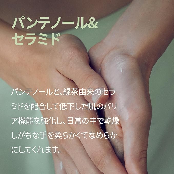 【パンテノールとセラミド配合】肌バリアをケアする成分であるパンテノールと緑茶由来のセラミドを配合し、低下した肌のバリアを集中ケアし、日常の中で乾燥しがちな手を柔らかくてなめらかにしてくれます。