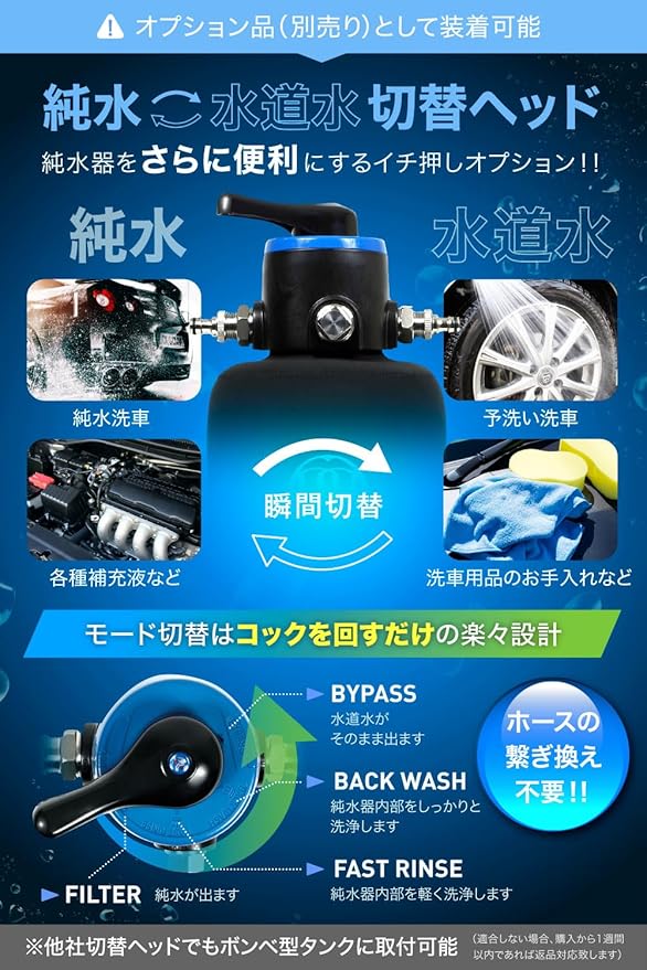 ✅ 使い方はとても簡単 ① IN側を水道、OUT側を散水ノズルまたは高圧洗浄機へ接続 ② 洗車〜すすぎは水道水でOK ③ 仕上げだけ純水で流すと、樹脂が長持ちして経済的です 業務用の品質ながら、扱いやすくご家庭でも簡単に使えるのが特徴です。