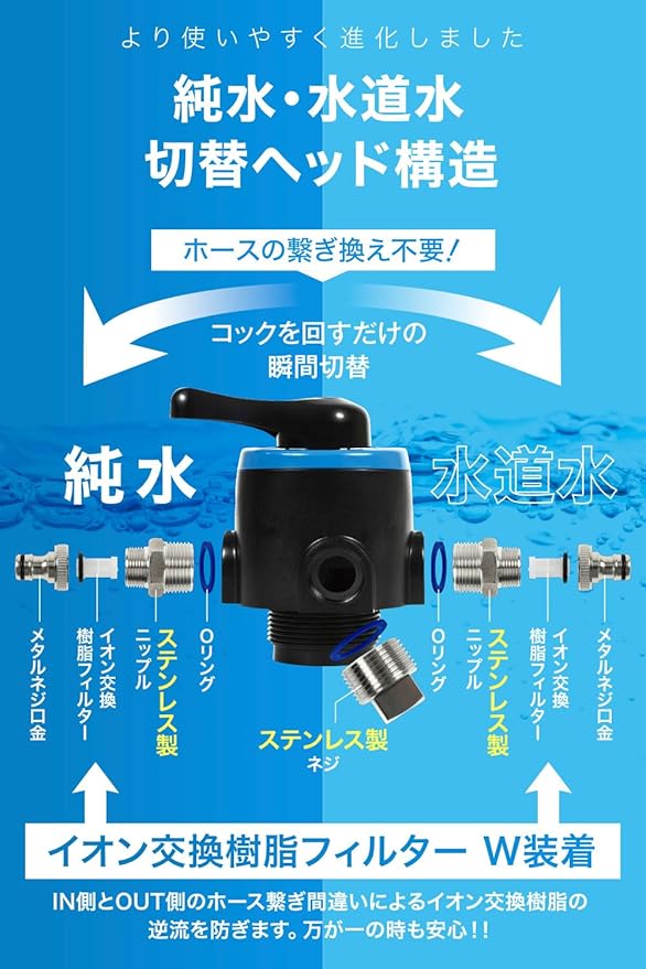✅ 使い方はとても簡単 ① IN側を水道、OUT側を散水ノズルまたは高圧洗浄機へ接続 ② 洗車〜すすぎは水道水でOK ③ 仕上げだけ純水で流すと、樹脂が長持ちして経済的です 業務用の品質ながら、扱いやすくご家庭でも簡単に使えるのが特徴です。