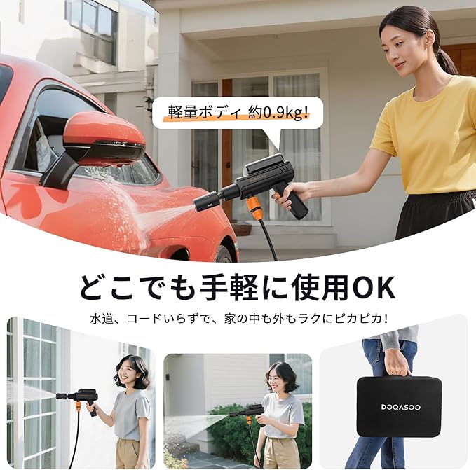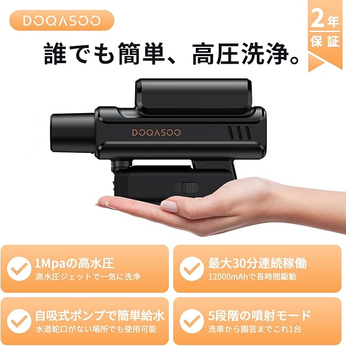 【安心の国内保証24ヶ月付き!一家に一台の万能クリーナー】 コンパクトに折り畳めるから、家庭の収納スペースを圧迫しないのはもちろん、車のトランクやアウトドアギアのすき間にもすっぽり収まります。家庭用として日々のお掃除をラクにし、レジャー用としてアウトドア生活をより快適にする、まさにかけがえのない万能クリーナーです。ご購入の日から30日間無料交換・2年間の商品保証があり、万が一商品は初期不良や故障などがありましたら、また使用中に質問がある場合は、いつでもお気軽にお問い合わせください。「ご注意:DOQASOOの コードレス高圧洗浄機はテスト後に出荷しているので水分が多少残っている場合はありますが製品の性能に問題はありません。」