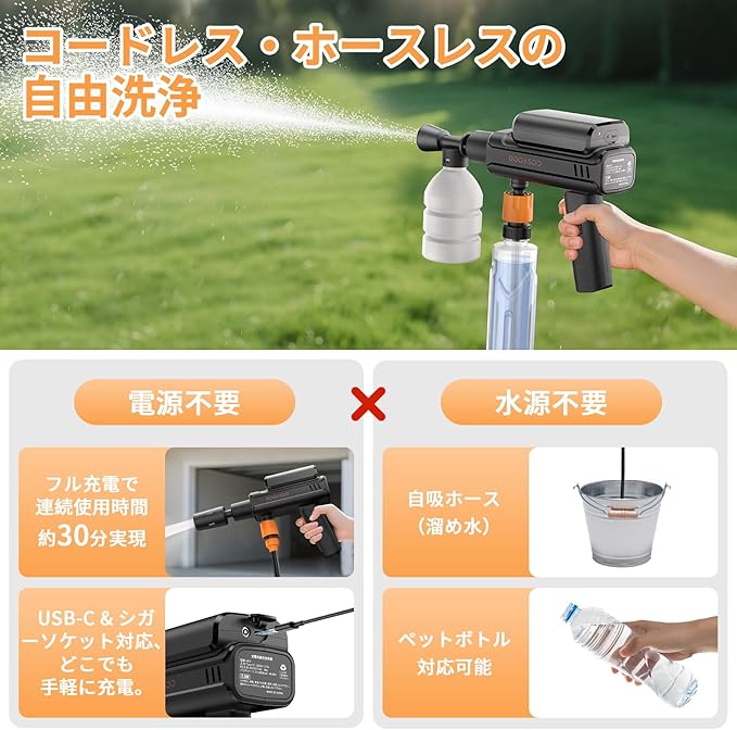 【業界革新!充電しながら使用可能!大容量12000mAhでアウトドアも安心の無限駆動】12000mAhバッテリー単体でも最大30分連続使用可能なので、お庭の水やりから愛車の洗車まで、バッテリー切れの心配無用です。他にはない「充電しながら使用可能」機能で、家庭のコンセントはもちろん、キャンプやドライブ先では車のシガーソケットから即充電。