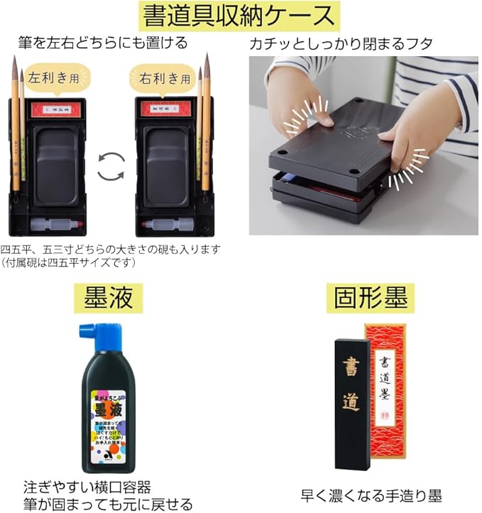 太筆、細筆、固形墨、墨液(180mL)、軽量両面硯(表面:硯、裏面:墨池)、ラバーツイン文鎮(185g)、下敷、半紙ばさみ、筆巻、スポイト式水差し、書道具収納ケース、筆置き、筆の説明書、ショルダーベルト