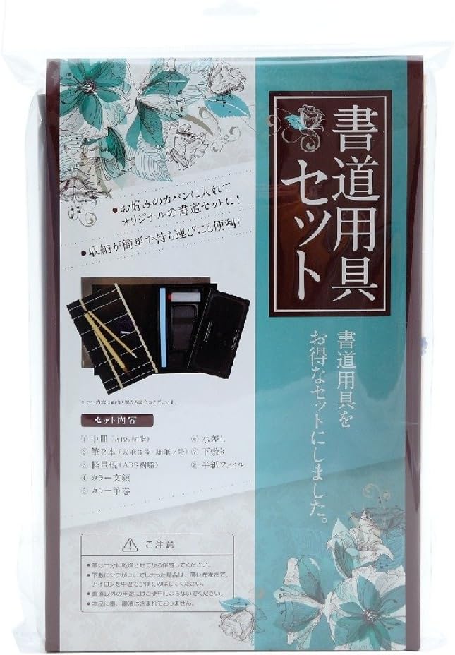セット内容:中皿(ABS樹脂)/筆2本(太筆3号・細筆7号)/軽量硯(ABS樹脂)/カラー文鎮/カラー筆巻/水差し/書道下敷/半紙ファイル/筆置き