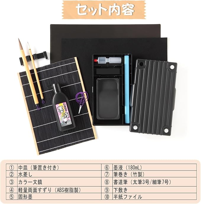 【セット内容】筆(太・細2本組)/墨液/軽量硯(樹脂)/下敷/中皿/半紙ファイル/水差/文鎮/固形墨/筆巻/筆置き