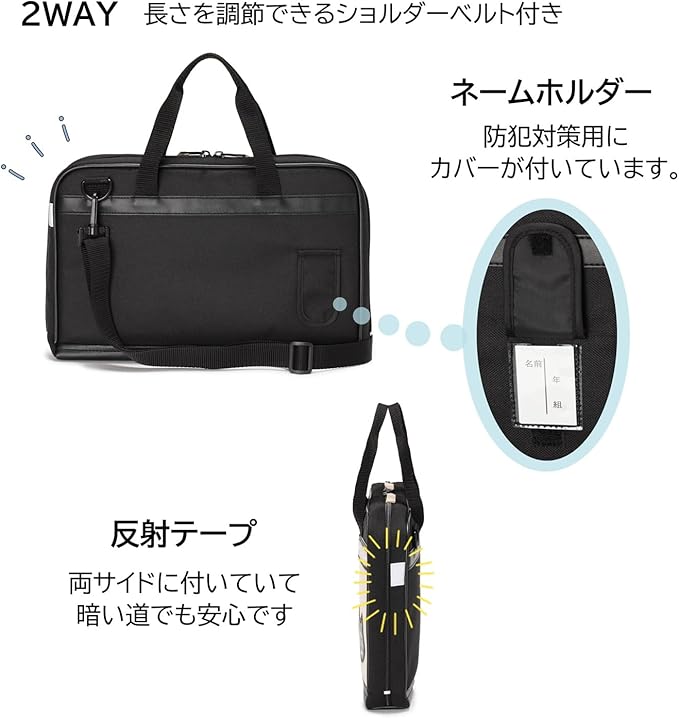 両サイドに光を反射するテープ付きで夜道でも目立ちます。