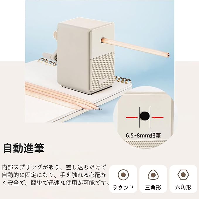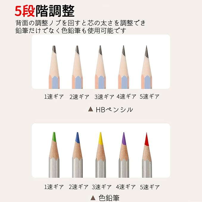 【5段階の厚み調整】:背面の調整ノブを回すと芯の太さを調整でき鉛筆だけでなく色鉛筆も使用可能です