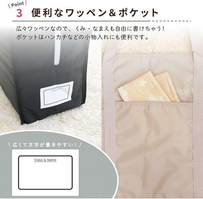 【上部ファスナー式】お昼寝布団セットがすっぽりと入ります。さらにハンカチ等の小物を入れることができる両面ポケット付き。