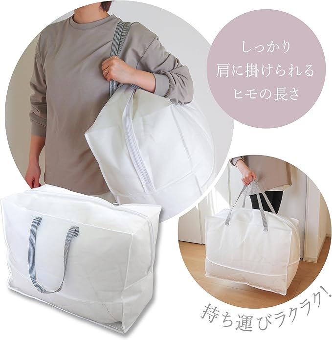 ●肩にも掛けられる長めの持ち手で、持ち運びに便利な布団収納袋