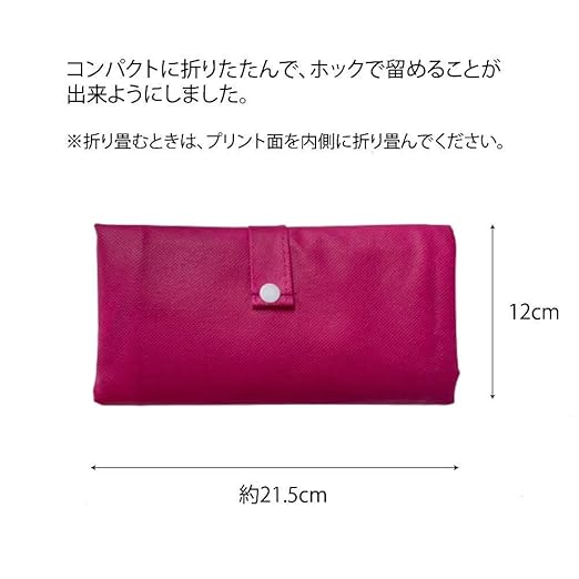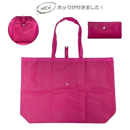 【大きいサイズ】W640xH450xマチ150mm(肩紐660mm) ※多少の誤差はご容赦ください。 使用時はポケットにホックが付いています。 未使用時は、約、縦12cm、横21cmのコンパクトサイズにたたんで ホックで留められます。