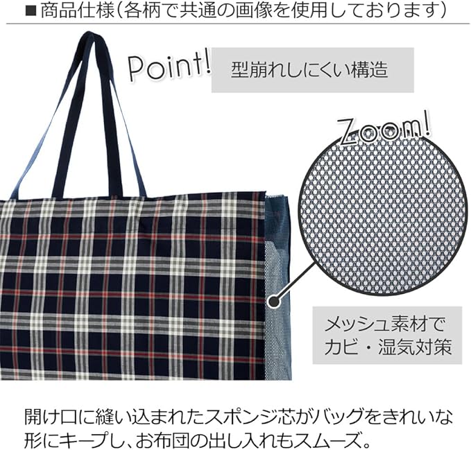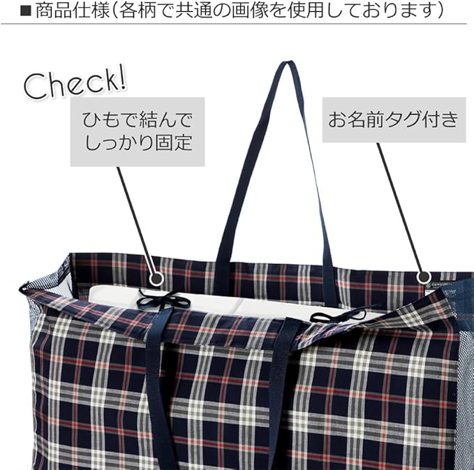 ゆったりマチ幅のお昼寝布団バッグ。厚めのお布団・枕も収納できるゆったりマチ幅。型崩れしにくいので、お布団の出し入れもスムーズです。