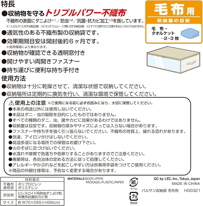 レック バルサン 収納袋 (毛布用) /ダニ除け・防虫・抗カビ抗菌加工/幅70 奥行55 高さ28cm H00321