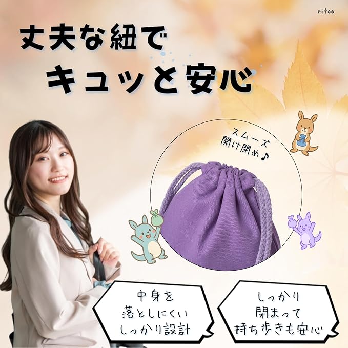 【紐がしっかり閉まる】 太めの紐でしっかり閉まり安心感◎。無地 巾着袋 はシンプルな 女性 向けスタイルにも合い、子供 用にもかわいく使えます。ミニ 巾着 なら学校 や 保育園 にも大活躍。持ち歩きたくなる かわいい 収納袋 です。