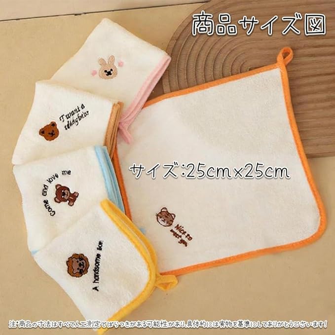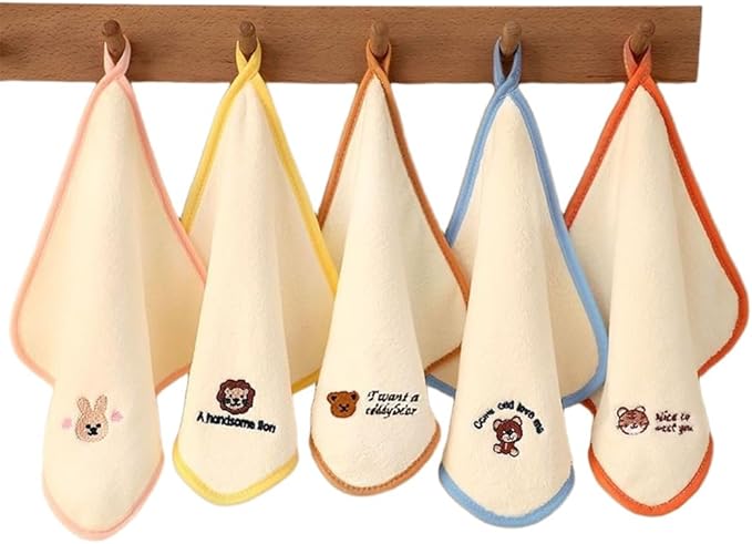 ループ付きタオル 5枚セット25x25cmループタオル ガーゼハンカチ 紐付きタオル 幸せの黄色いハンカチ 柔らかくて肌に優しい 吸水速乾 ハンドタオル 口拭きタオル ハンカチ 女の子 男の子 ミニタオル 保育園 幼稚園 入園入学準備 (アニマルパターン 5色各1枚)