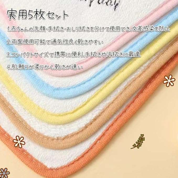 4.【5 枚セットで使い分けが自由自在】 ミニタオルを 5 枚セットで販売しているため、赤ちゃんの洗顔・手拭き・おしり拭きなど用途ごとに分けて使え、交差感染を防ぐことができます。コンパクトサイズなので持ち運びも便利で、外出時の汗拭きにもぴったりです。