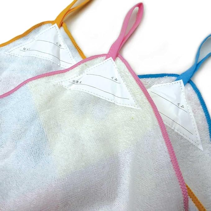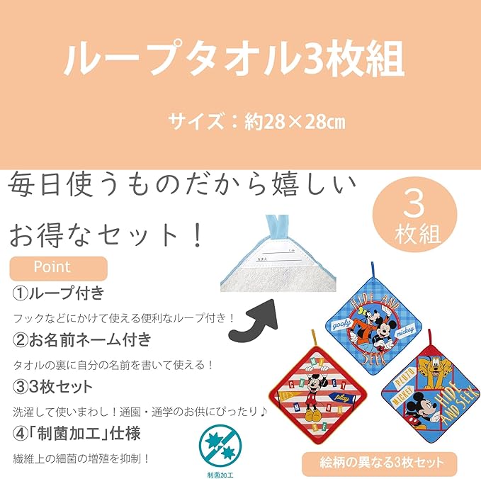 フックに引っかけられる便利なループ付きタオル 黄色ブドウ球菌や肺炎桿菌などの人体に有害な細菌の増殖を抑え、清潔に保つ制菌加工付きです。 裏面にはクラスと名前が書けるお名前ネームタグ付きです。