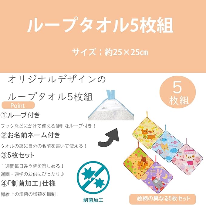 丸眞 ループタオル 5枚組 ピッコリーノ ギャラクシートリップ 入園入学グッズ 入園入学準備 保育園 幼稚園 小学校 保育園 幼稚園 入園 入学 園児 男の子 タオル ループタオル ループ付きタオル ループ かけられる かけれる 手拭き 165016300