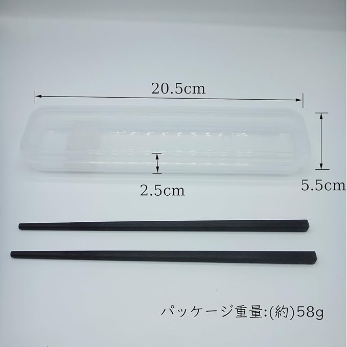 材質:箸/メタクリル樹脂 ケース/PP樹脂 サイズ:箸の長さ/19cm ケース/幅20.5 奥行5.5 高さ2.5cm 本体重量:(約)18g パッケージ重量:(約)58g
