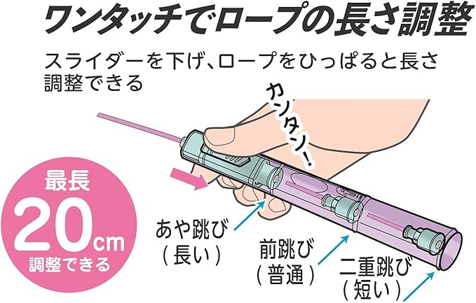 【特徴1】持ち手のスライダーを下げロープを引っ張るだけのカンタン長さ調節♪