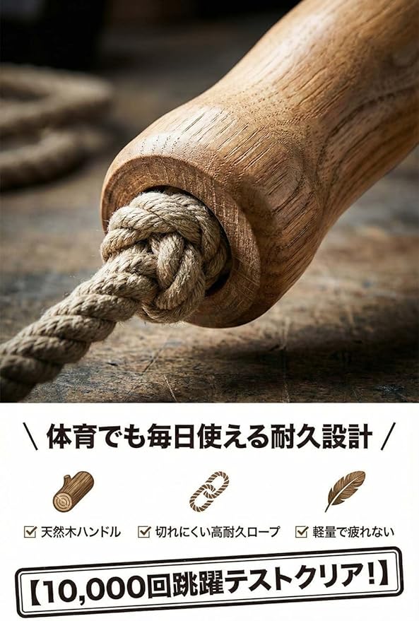 【天然木強化木製グリップ採用|耐久性 軽量性を両立】天然木を使用した【強化木製グリップ】を採用。 見た目の美しさだけでなく、耐久性が格段に向上し、破損リスクを最小限に抑えます。 さらに本体は約130gの軽量設計で、長時間の使用でも疲れにくい仕様に。 ──機能性とデザイン性を兼ね備えた、ワンランク上のジャンプロープです。