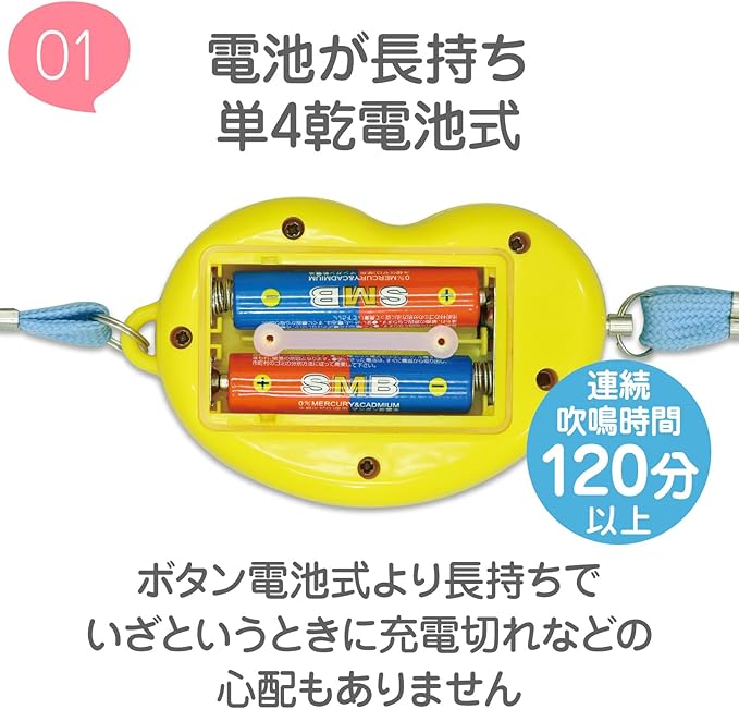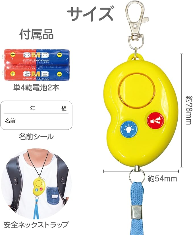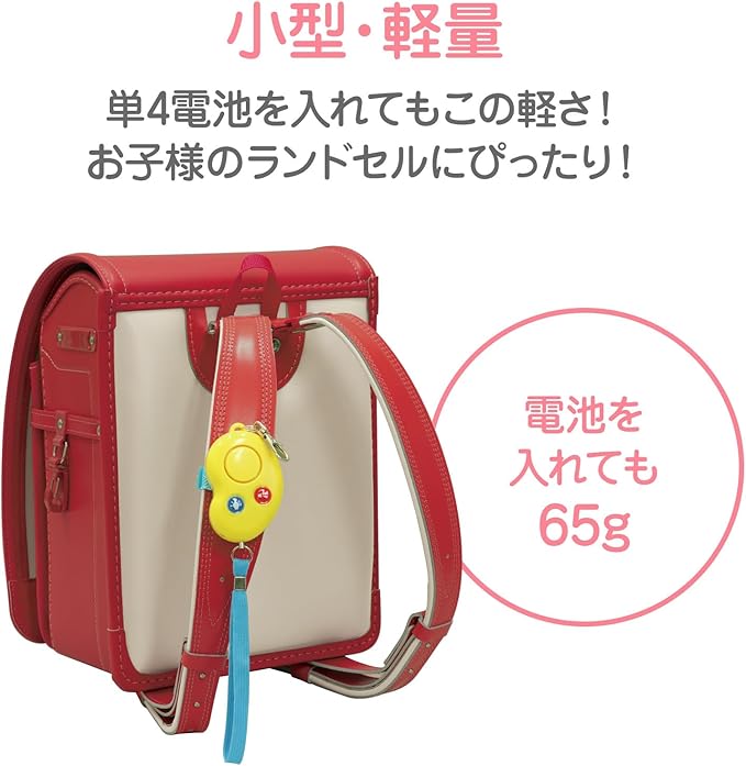 すぐに使える単4電池2本付き。ランドセル取付用ベルト、安全ネックストラップ付いてて子供にも嬉しい仕様。