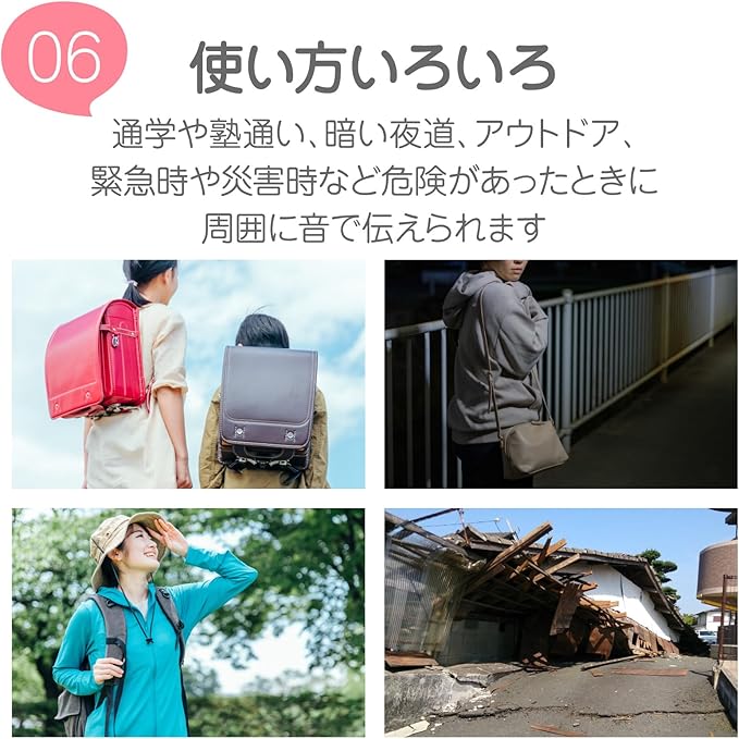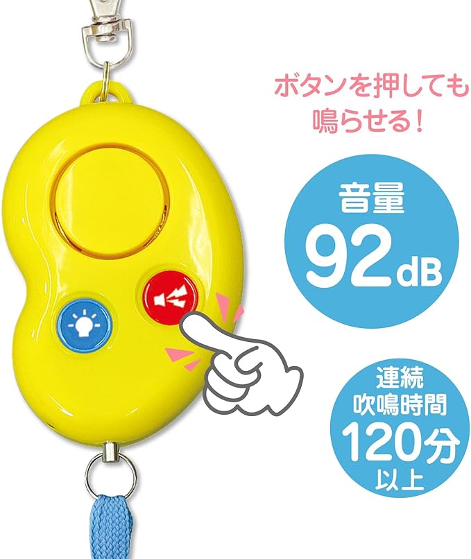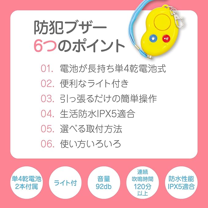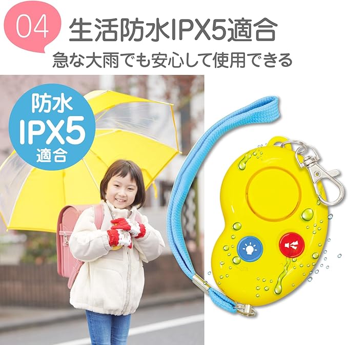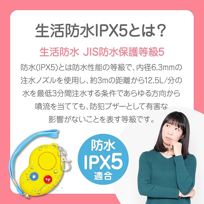 ※生活防水(IPX5)とは防水性能の等級で、内径6.3mmの注水ノズルを使用し、約3mの距離から12.5L/分の水を最低3分間注水する条件であらゆる方向から噴流を当てても、防犯ブザーとして有害な影響がないことを表す等級です。