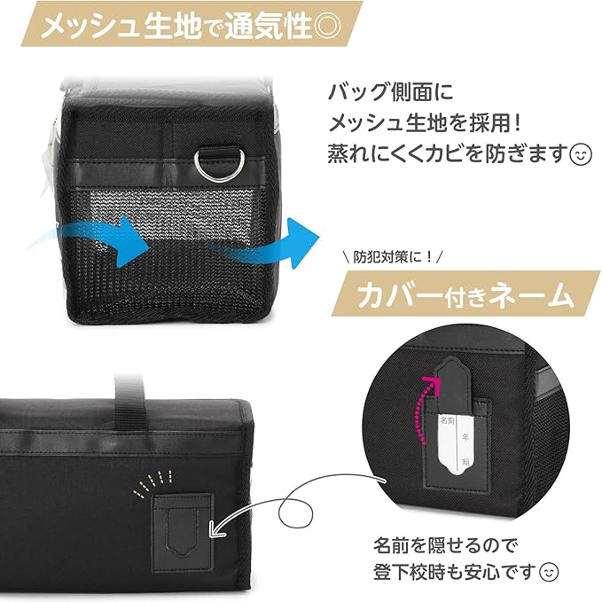 汚れにくい撥水加工生地で、サイドには通気性抜群のメッシュ素材を使用。