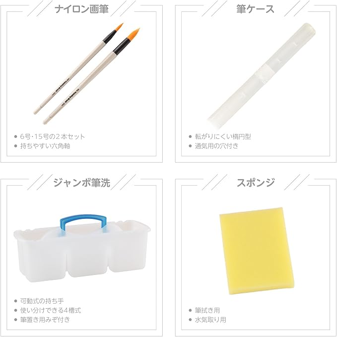 【セット内容】バッグ/ショルダーベルト/ナイロン画筆2本組(6号丸・15号丸)/筆ケース/筆洗/パレット/絵の具12色 /スポンジ