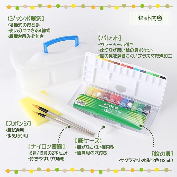 【セット内容】バッグ/ショルダーベルト/ナイロン画筆2本組(6号丸・15号丸)/筆ケース/筆洗/パレット/絵の具12色 /スポンジ
