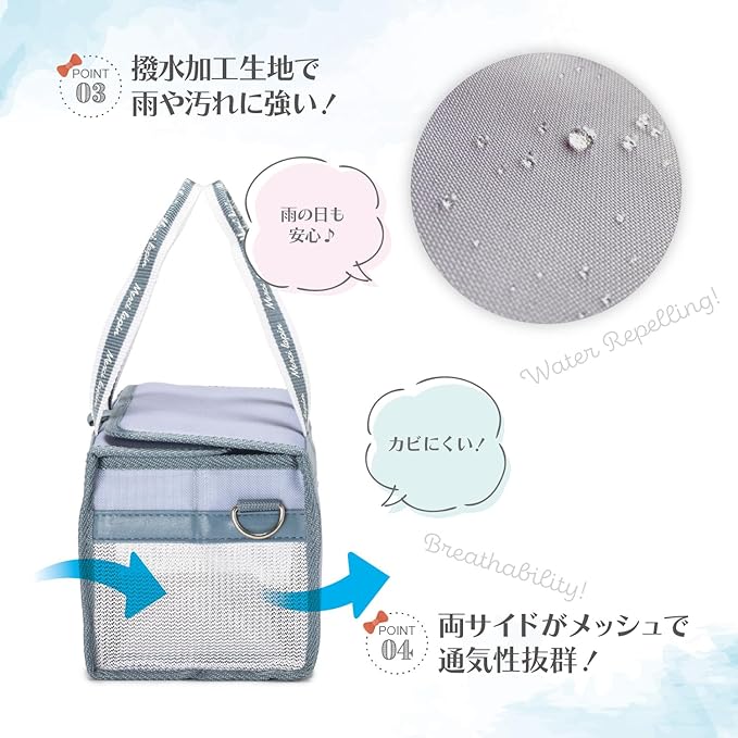 側面にはメッシュ素材を使用。カビを防いで清潔に使えます。