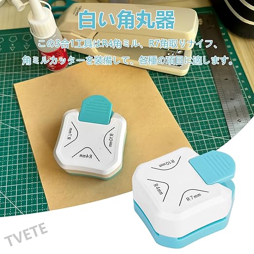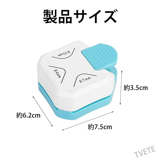 【パッケージの内容】角丸面取り器*1個。サイズ規格は約7.5cm*6.5cm*3.5cm、角のカットサイズはR4mm/R7mm/R10mm角丸半径です。
