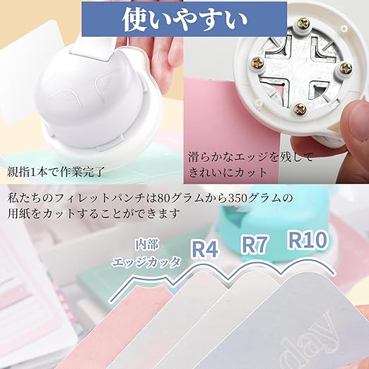 【4-in-1多機能設計、多シーンフィレット需要をカバーする】:R 4 mm、R 7 mm、R 10 mmの3種類の常用フィレット規格と1種類の内側面取り機能を集積し、単独で異なるサイズのパンチ器を購入する必要がなく、1セットで多様なフィレット処理需要を満たすことができる——R 4 mmは小型カード(名刺、付箋など)に適し、精緻でコンパクトなフィレットを作ることができる、R 7 mmは写真、普通紙に適しており、美観と実用性を両立している。R 10 mmは被膜フィルム、PVC紙などの比較的厚い材質に適し、エッジの折れ割れを避ける、内側面取り機能は紙の内側の尖った角(封筒の開口部、マニュアル内のページなど)を処理することができ、「単一パンチ機能の限界、頻繁な工具交換」の痛い点を解決し、DIYプロジェクト、オフィス文書処理をより効率的にすることができる。