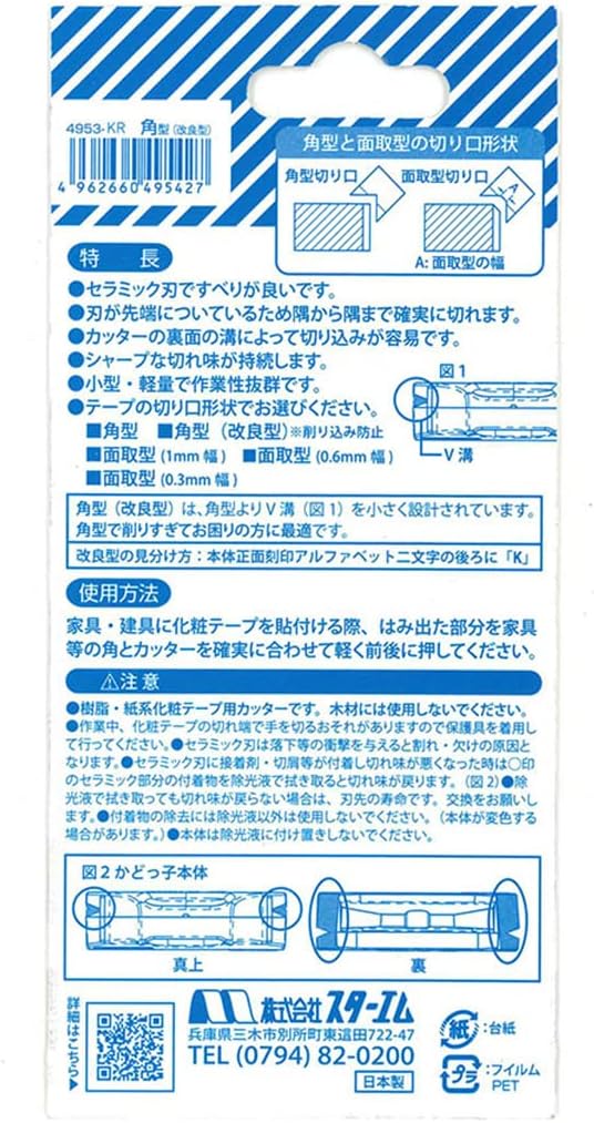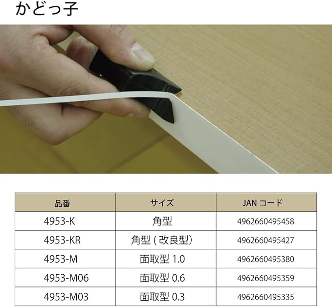 家具、建具等に化粧テープや木口テープを貼り付ける際、はみ出た部分をかどっ子を前後にスライドさせて切り取ります。 防犯フィルムやダイノックフィルムのカットにも使用されています。