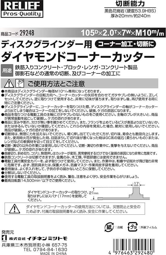 イチネンアクセス ツール事業部 リリーフ(RELIFE) ディスクグラインダー用 ダイヤモンドコーナーカッター 29248