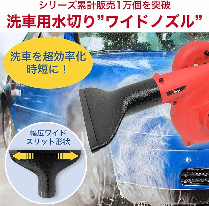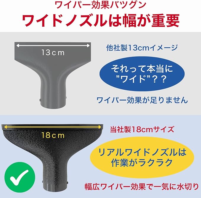 【日本製】キズ防止プロテクトバンパー搭載、洗車用 水切りワイドノズル。特殊形状の内部ジェットフィン構造により、短い全長でもノズルの両端まで均一で力強い風を実現。幅18cmのワイドスリット形状が広範囲の水滴を一気に吹き飛ばし、水切れ抜群&作業効率アップ。※ノズルのみの商品です。ブロア本体は付属しません。