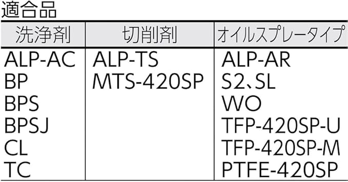 ●スプレー適合品:ALP-AC・BP・BPS・BPSJ・CL・TC(洗浄剤)、ALP-TS、MTS-420SP(切削剤)、ALP-AR・S2・SL・WO、TFP-420SP-U・M、PTFE-420SP(オイルスプレータイプ)●30cmの長さをもつSUS製替えノズル:30cmの長さをもつSUS製替えノズル