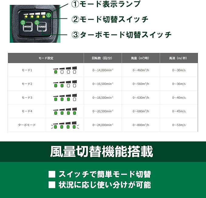 風量切替機能を搭載(モード1~4・ターボモード)し、作業に合わせ簡単に調整