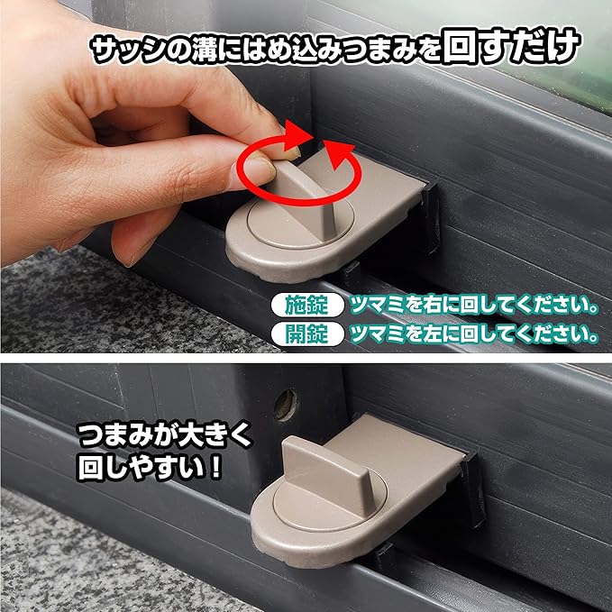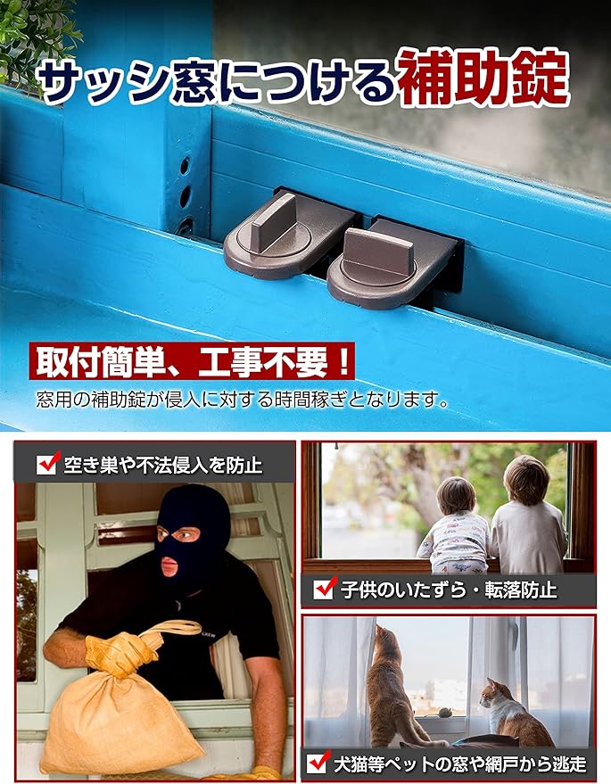 ✅【サッシ窓用補助錠、安全対策に】サッシ窓につける補助錠です。サッシの溝に差し込んでつまみを回転だけで簡単に設置できるのサッシ窓用補助錠です。サッシに取り付けて、窓からの侵入を防ぎます。空き巣や泥棒やひとり暮らし女性向けに防犯対策に、ペットや小さなお子さまのいる家庭の安全対策としてもご使用いただけます。防犯効果を高めるためできるだけ上下2箇所に取付けることをお薦め致します。盗難防犯に絶対的な商品ではありません、予めご了承ください。