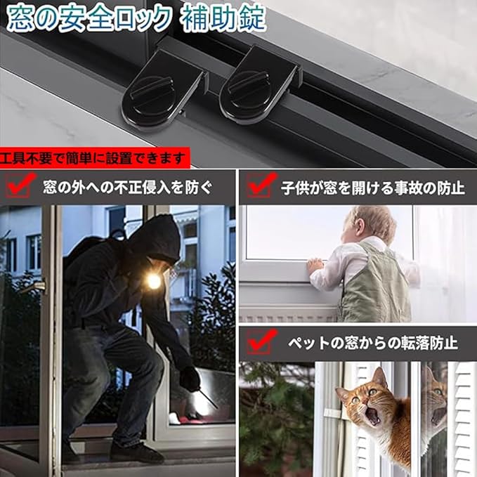 ✅【引き戸補助錠】:引き戸補助錠を窓の溝に差し込み、ノブを回すだけで簡単に取り付けられます。窓枠に設置することで、他人が窓から侵入するのを防ぎます。ペットや小さなお子様がいるご家庭にも最適です。上下に設置するとより効果的です。本製品は絶対的な盗難防止製品ではありませんのでご注意ください。