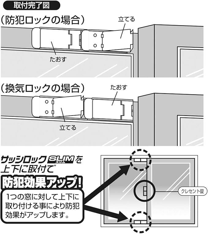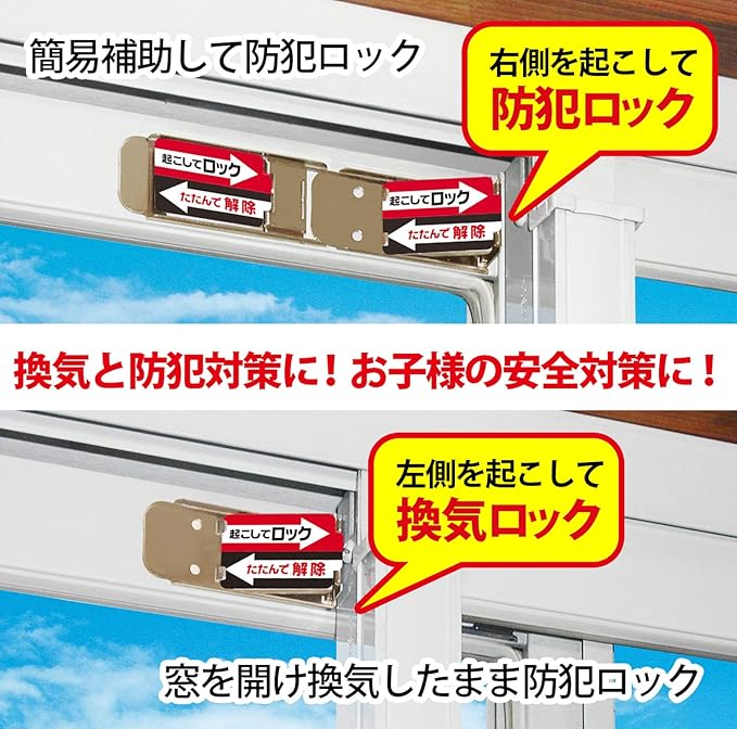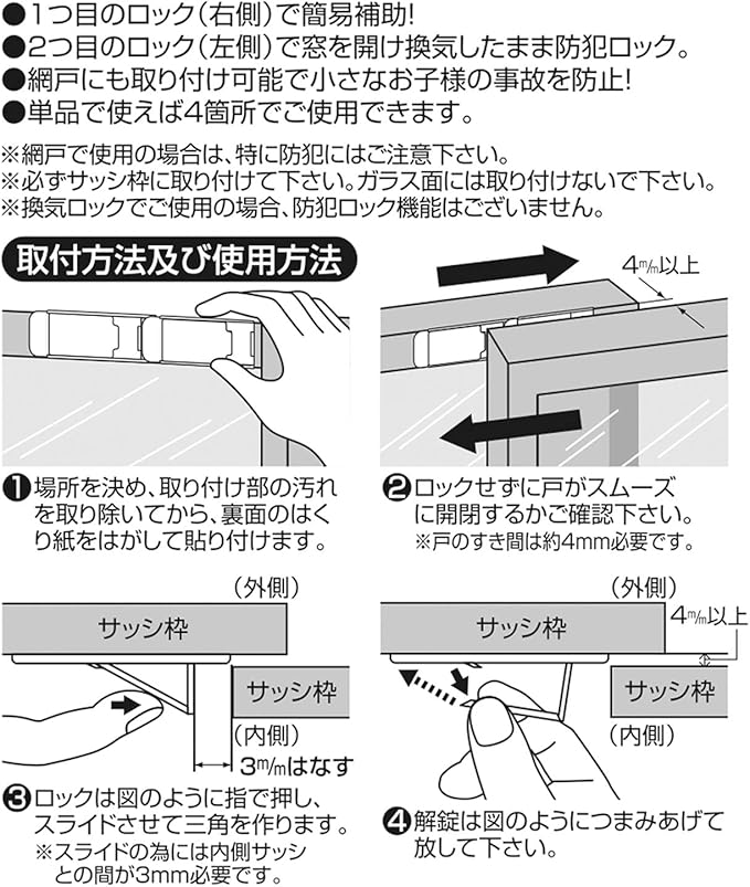サッシ枠に取り付けて、補助的に窓をロック。 取り付け位置によって開閉位置の調整が可能。 横に2個並べて使えば、「窓を閉じた状態」「少し開いた換気状態」の2通りでロックできます。 サッシのクレセント錠との併用で防犯効果アップ。 もちろん、単品で4箇所の簡易補助錠としても使用できます。 網戸にも取り付けられるので、お子さまの安全対策にも効果的。 素材・材質:ステンレス、粘着テープ 生産国:タイ ●取付可能寸法=クレセント錠を開錠した状態で、外側・内側サッシ枠の間4mm以上の隙間が必要です。