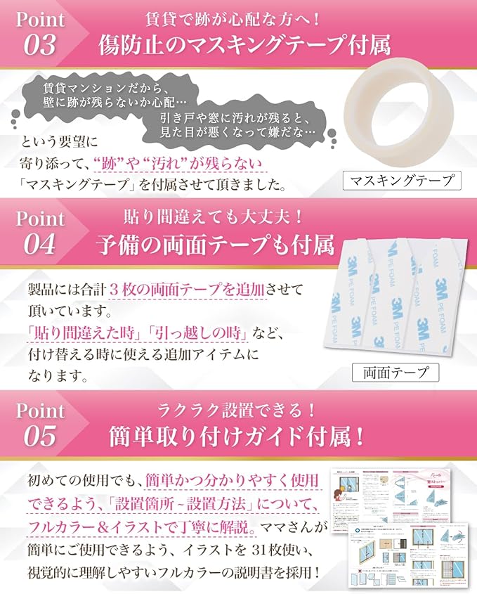 【フルカラー説明書が付属!】 本製品には手軽に「転落 防止」「落下 防止」の対策ができるよう、商品の設置方法 はもちろん 賃貸 で 跡が残らない マスキングテープの使用方法 など丁寧に使用方法を解説させて頂きました。女性のお客様1人でも使い始められるよう、イラスト31枚で徹底解説しています。
