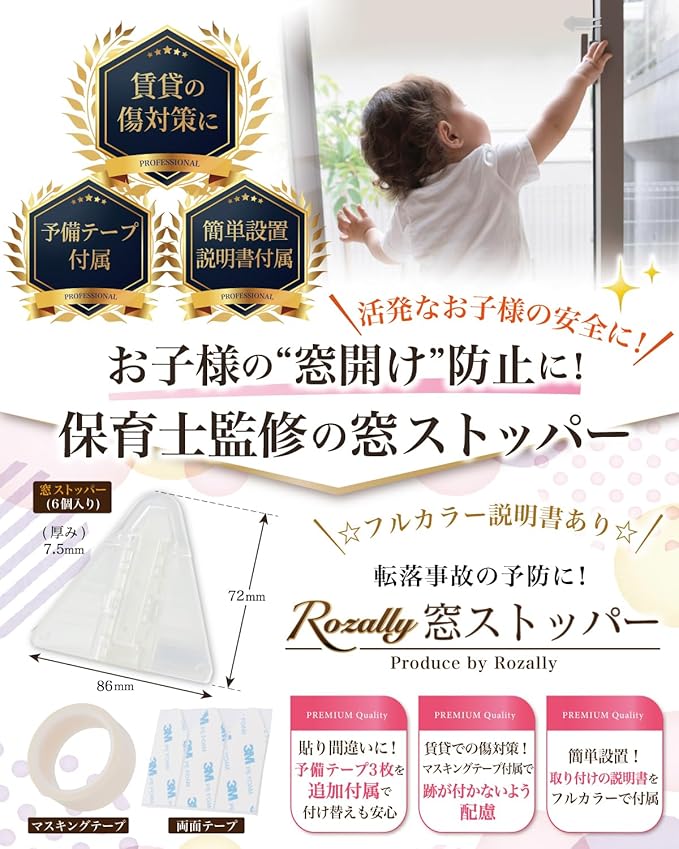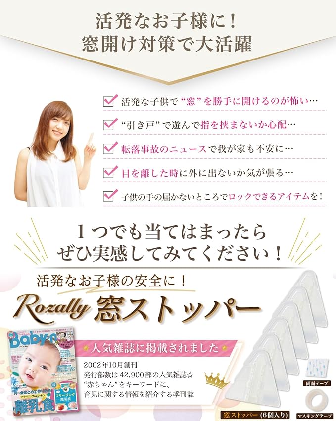 【保育士が監修】 Rozally 窓ストッパー がついに正式販売開始。 いたずら好きの 子供 が 窓 を開けて ベランダ に勝手に出ないように、ロック したい というお客様の声から生まれた 窓 ストッパー です。 窓ロック が可能なことがもちろん「 引き戸 / 扉 / ドア」 などに設置することで「いたずら防止」と「指はさみ防止」の両方の対策が可能です。 マスキングテープ が付属で 賃貸 でも 簡単に跡を残さず 剥がせる ため、 育児中によくある「指はさみ対策」や「いたずら対策」でお悩みのママさんに、 使いやすい ベビーガード として選ばれています。 企画&設計では 新生児 や 子供 の育児に詳しい【保育士】の先生からアドバイスをもらい、 ベランダからの「転落防止」「落下防止」を考え、設置方法をフルカラー説明書として添えて企画&開発しました。