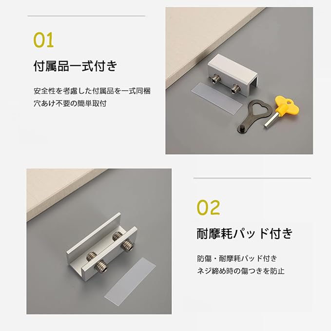専用工具と2種類の鍵(正面固定の黄色鍵・側面固定の黒色鍵)がセットになっており、穴あけ不要で誰でも簡単に取り付け可能です。賃貸住宅でも穴あけの心配がなく、手軽に設置できることは、特に便利な特徴です。これにより、防犯グッズとしても選ばれる理由となります。