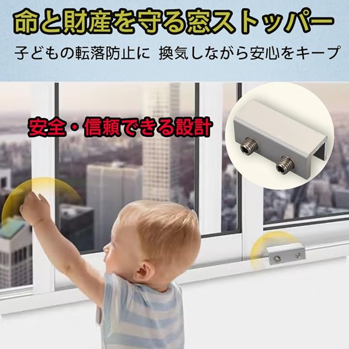 【家族の安全】適切な開き幅に窓を固定し、転落防止や子供の安全対策にも効果的。お子様やペットの不意な転落や事故を防ぎます。また、窓を少し開けた状態で固定可能なので、室内の換気を維持しつつ、防犯対策面でも安心感を提供します。