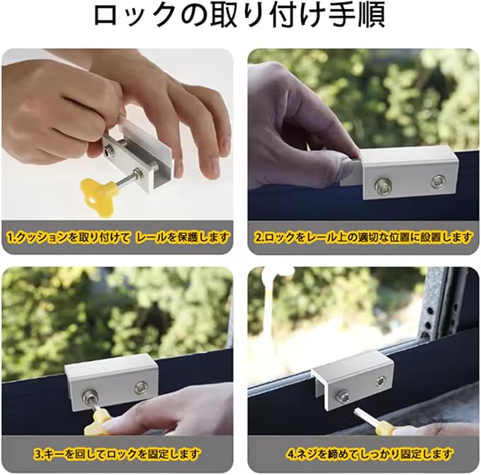 【幅広い適用シーン】家庭内のサッシ窓やベランダドア、引き戸にも対応し、後付け設置が可能。オフィス、宿泊施設、賃貸住宅などでも広く活躍します。頑丈なアルミ合金製で耐久性抜群、錆びにくく長期使用が可能です。