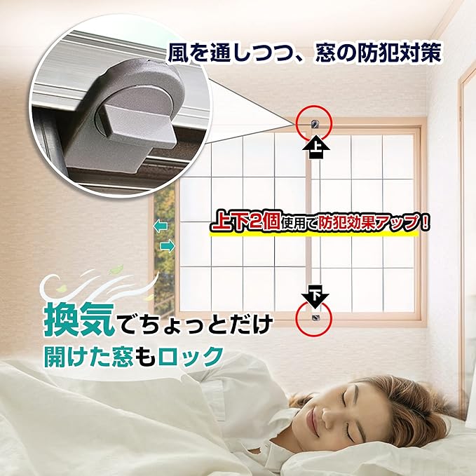 ✅【換気しながら防犯対策】「換気したいけど窓を開けるのが不安」というお悩みを「サッシ用補助錠」が解決します!窓を少しだけ開けた状態でロックできるので、空気を入れ替えながら安心して使用できます。窓の鍵を開けられる年齢のお子様がいるご家庭、換気用の隙間を開けつつも、ベランダには出られないようにできるから安心です。キッチン、シャワールーム、トイレなどでの換気用途にも便利です。ただし、防犯効果は完全に閉めた場合より低下するため、ご注意ください。