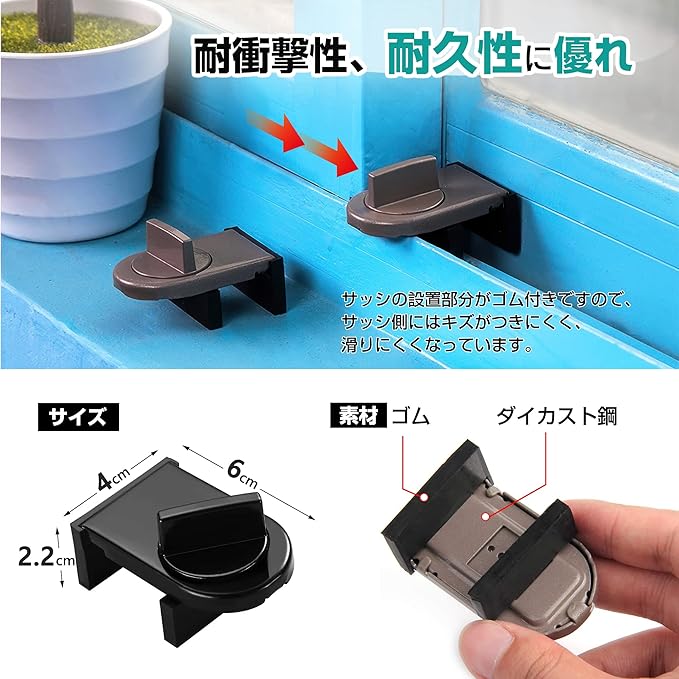 ✅【耐衝撃性・耐久性に優れた設計】高品質のダイカスト鋼とゴムを使用し、優れた耐衝撃性と耐久性を実現しました。大きめのつまみにより、簡単かつ確実に締め付けが可能です。サッシに設置する部分はラバー素材を使用サッシへのダメージを最小限に抑えます。