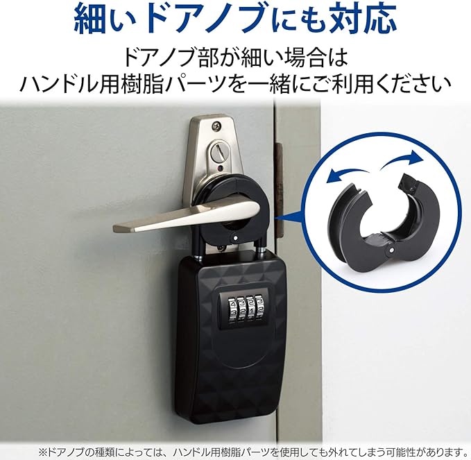 ドアノブ部が細い場合は、ハンドル用樹脂パーツを一緒にご利用ください。※ドアノブの種類によっては、ハンドル用樹脂パーツを使用しても外れてしまう可能性があります。